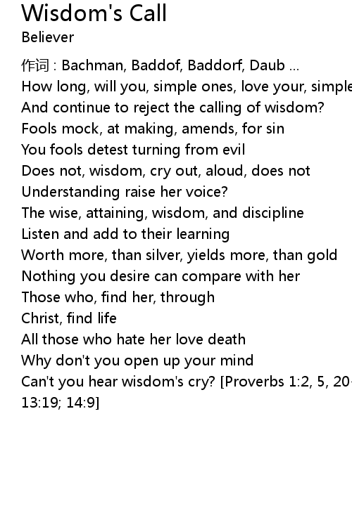 | Can' t you hear wisdom' s cry? Proverbs 1: 2, 5, 2022 3: 13, 14 8: 1, 9, 3536 13: 19 14: 9 |