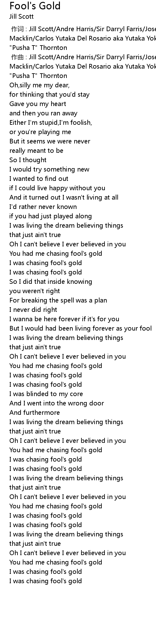 | [00:00.556] | 作曲 : Jill Scott/Andre Harris/Sir Darryl Farris/Joseph Macklin/Carlos Yutaka Del Rosario aka Yutaka Yokokura/Donavan Knight/Terrence "Pusha T" Thornton |