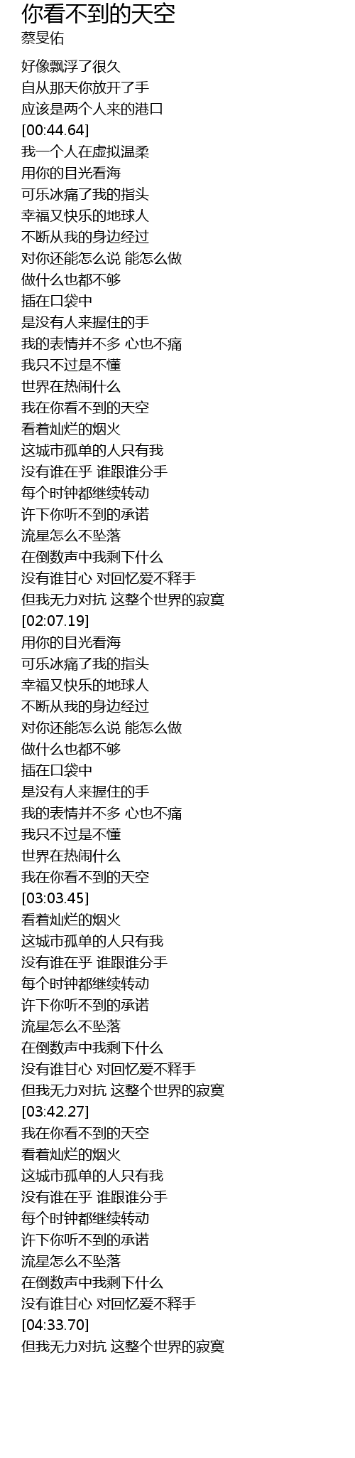 | [03:00.88] | wǒ zài nǐ kàn bú dào de tiān kōng |