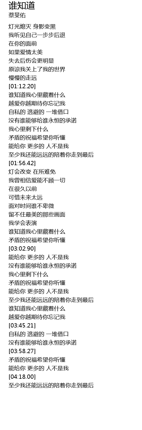 | [03:36.34] | 谁知道我心里藏着什么 |