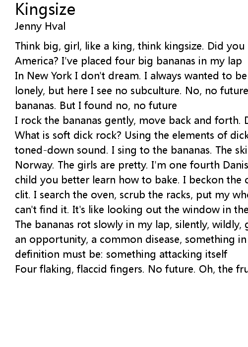 Think big, girl, like a king, think kingsize. Did you learn nothing in America? I've placed four big bananas in my lap |