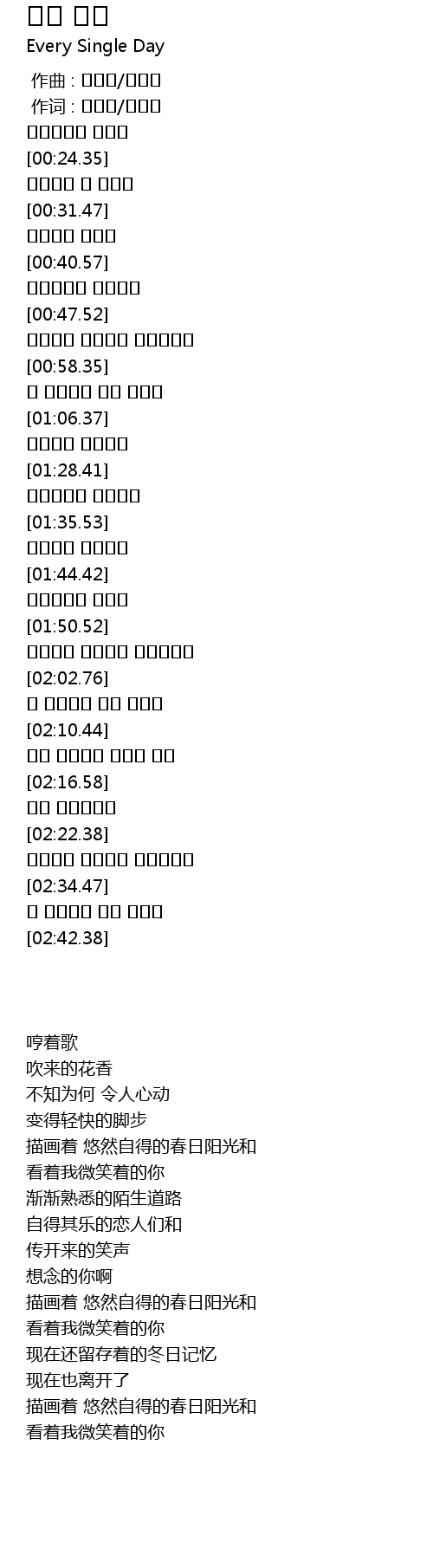 | [02:25.33] | 그려보네 여유로운 봄날햇살과 |