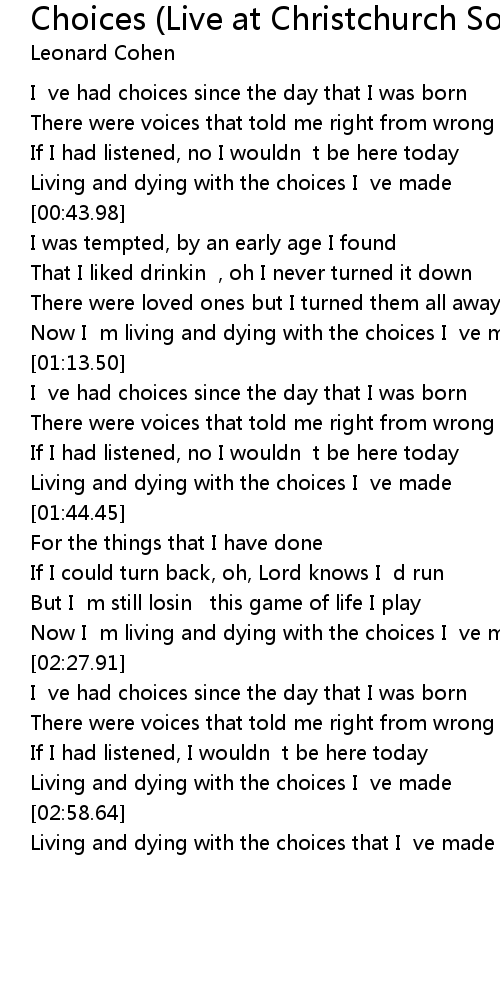 Choices (Live at Christchurch Soundcheck, 2013) Lyrics