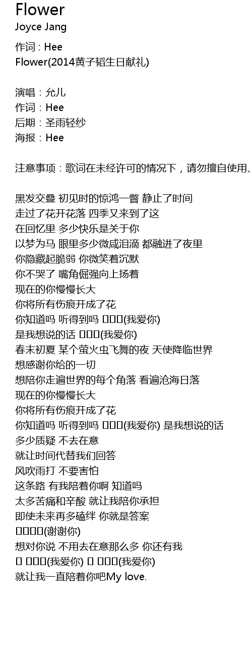 | 注意事项:歌词在未经许可的情况下,请勿擅自使用、修改、转载,谢谢合作。 | |