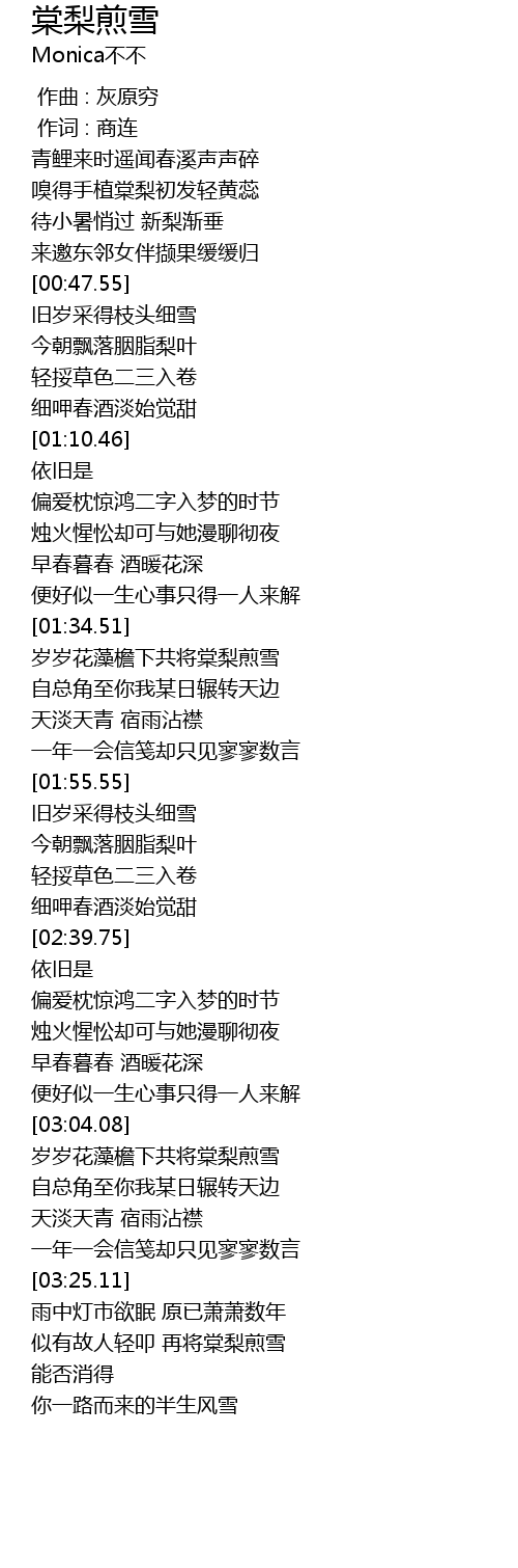 | [03:36.13] | 似有故人轻叩 再将棠梨煎雪 |