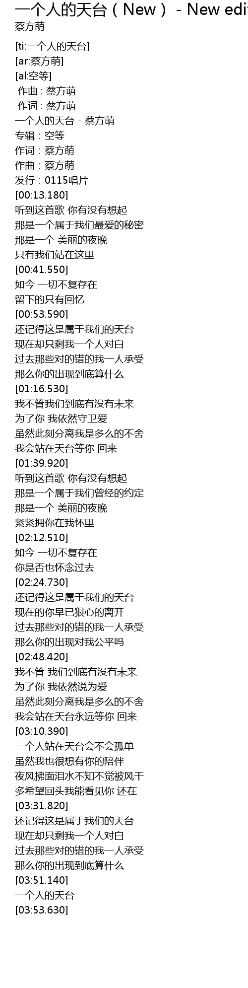 | [00:00.020] | 一个人的天台 - 蔡方萌 |
