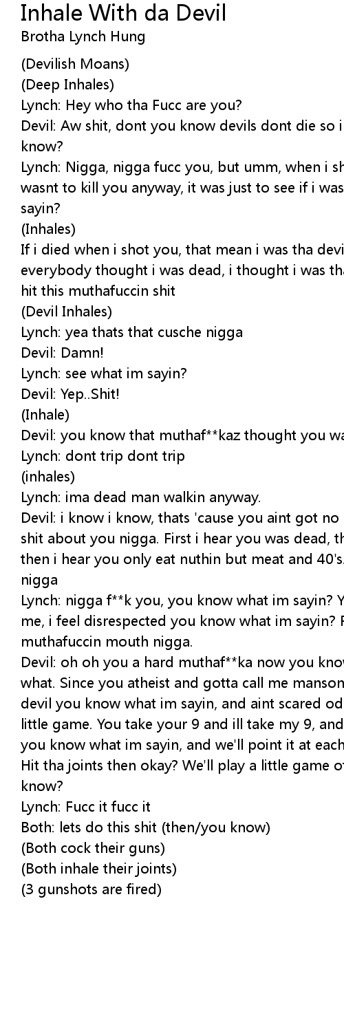 Devil: oh oh you a hard muthaf**ka now you know im sayin. well ill tell you what. Since you atheist and gotta call me manson 'cause you dont believe in tha devil you know what im sayin, and aint scared od dying and shit, lets play this little game. You take your 9 and ill take my 9, and we'll cock that shit back you know what im sayin, and we'll point it at each other you know what im sayin, Hit tha joints then okay? We'll play a little game of Russion Roulette then you know? |