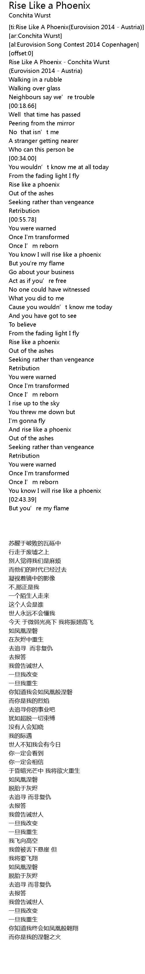 | [00:00.89] | Rise Like A Phoenix Conchita Wurst |