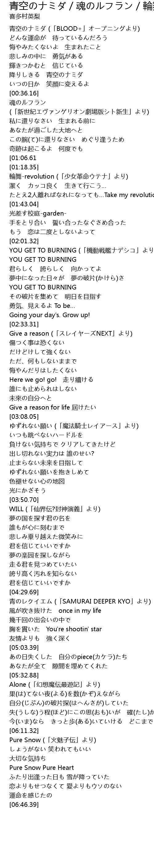 | [00:00.53] | 青空のナミダ (「BLOOD+」オープニングより) |