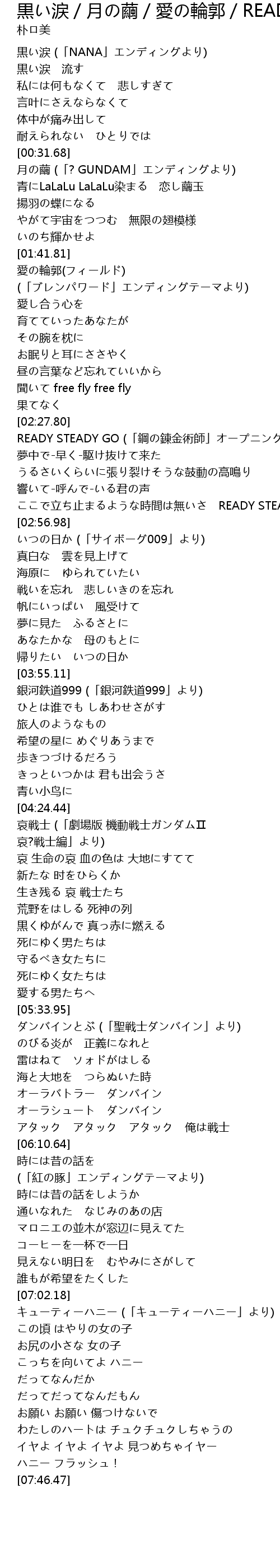 | Song | 黒い涙/月の繭/愛の輪郭/READY STEADY GO/いつの日か/銀河鉄道999/哀戦士/ダンバインとぶ/時には昔の話を/キューティーハニー |