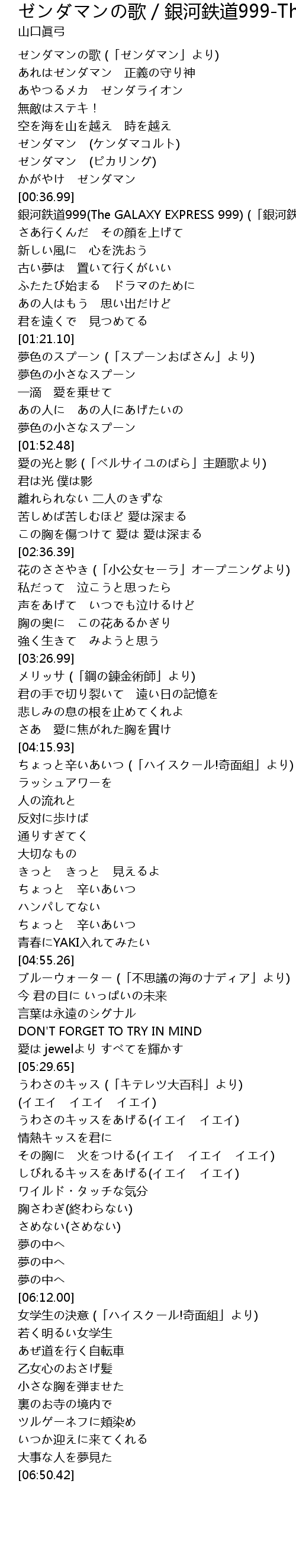 | [00:37.59] | 銀河鉄道999(The GALAXY EXPRESS 999) (「銀河鉄道999」より) |