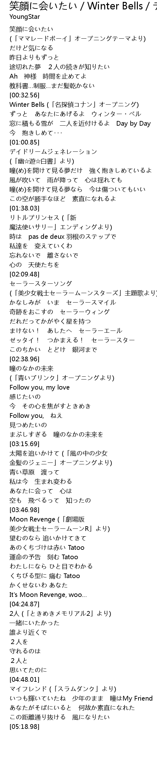 | [00:00.54] | 笑顔に会いたい (「ママレードボーイ」オープニングテーマより) |