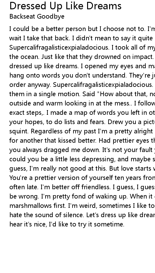 I could be a better person but I choose not to. I'm as selfish as a suicide, and wait I take that back. I didn't mean to say it quite like that. Supercalifragalisticexpialadocious. I took all of my memories and threw them in the ocean. Just like that they drowned on impact. In a flurry of nightmares dressed up like dreams. I opened my eyes and managed to find some clairty. Don't hang onto words you don't understand. They're just letters in unalphabetical order anyway. Supercalifragalisticexpialadocious. I took all of my worries spun them in a single motion. Said "How about that, now you're on the inside". I'm outside and warm looking in at the mess.. I followed you here, with planned exact steps,. I made a map of words you left in other peoples ears. Wrote down your hopes, to do lists and fears. Drew you a picture, it's pretty if you squint. Regardless of my past I'm a pretty alright kid. I loved you, I left you for another that kissed better. Had prettier eyes than you. For reasons unknown you always dragged me down. It's not your fault you were born in this town. But could you be a little less depressing, and maybe smile a bit more? Hey there, I guess, I'm really not good at this. But love starts with "L" and so does liar. You're a prettier version of yourself ten years from now. You're brilliant but often late. I'm better off friendless. I guess, I guess, I guess. Well I could be wrong. I'm pretty fond of waking up. When it comes to lucky charms I eat the marshmallows first. I'm weird, sometimes I like to be lonely. But other times I hate the sound of silence. Let's dress up like dreams and pretend we're free. I hear it's nice, I'd like to try it sometime. |