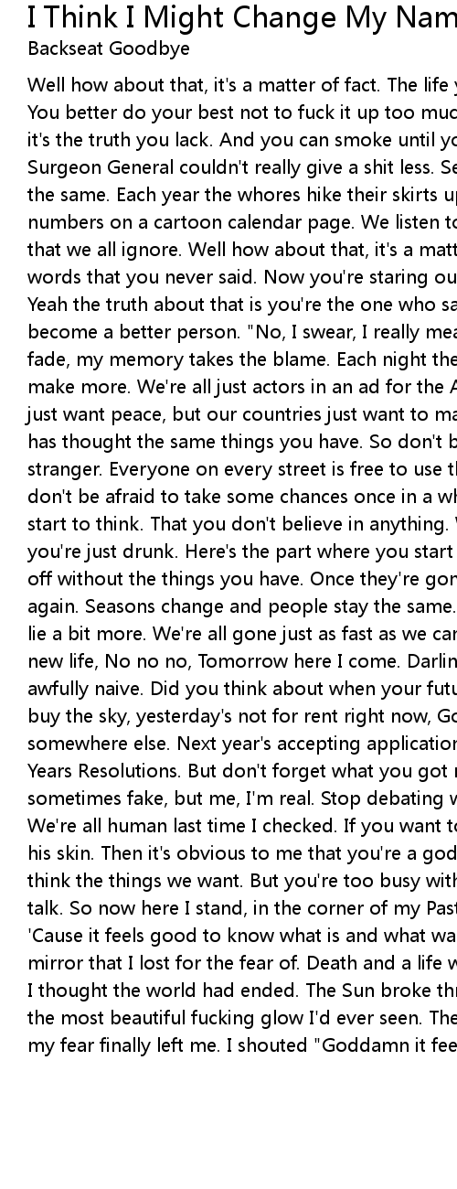 Well how about that, it's a matter of fact. The life you got is all you'll get. You better do your best not to fuck it up too much. Yeah the thing about that is it's the truth you lack. And you can smoke until your lungs turn black. The Surgeon General couldn't really give a shit less. Seasons change and people stay the same. Each year the whores hike their skirts up a bit more. We're all just numbers on a cartoon calendar page. We listen to the music, but it's the lyrics that we all ignore. Well how about that, it's a matter of fact. You retraced the words that you never said. Now you're staring out at a useless blank canvas. Yeah the truth about that is you're the one who said. I'm gonna change myself, become a better person. "No, I swear, I really mean it this time." Years they fade, my memory takes the blame. Each night the girls spread their legs just to make more. We're all just actors in an ad for the American Dream. We the people just want peace, but our countries just want to make war. Everybody everywhere has thought the same things you have. So don't be afraid to fall in love with a stranger. Everyone on every street is free to use their body as they please. So don't be afraid to take some chances once in a while. Here's the part where you start to think. That you don't believe in anything. Words are just words and you're just drunk. Here's the part where you start to act. Like you're better off without the things you have. Once they're gone you'll realize you fucked up again. Seasons change and people stay the same. Each year I find a new way to lie a bit more. We're all gone just as fast as we came. So I'm not counting on a new life, No no no, Tomorrow here I come. Darling, you're lovely, but you're awfully naive. Did you think about when your future might leave ya? You can't buy the sky, yesterday's not for rent right now, Go find your own forever somewhere else. Next year's accepting applications, For one night stands and New Years Resolutions. But don't forget what you got right here, My smile's sometimes fake, but me, I'm real. Stop debating wars, politics and freedom. We're all human last time I checked. If you want to kill a man for the color of his skin. Then it's obvious to me that you're a goddamn idiot. We're all free to think the things we want. But you're too busy with your bullshit to hear us talk. So now here I stand, in the corner of my Past and I don't want to go. 'Cause it feels good to know what is and what was. And the Future's just a mirror that I lost for the fear of. Death and a life without Love. And just when I thought the world had ended. The Sun broke through the pitch black sky . In the most beautiful fucking glow I'd ever seen. The buildings started singing and my fear finally left me. I shouted "Goddamn it feels good to be alive again!" |
