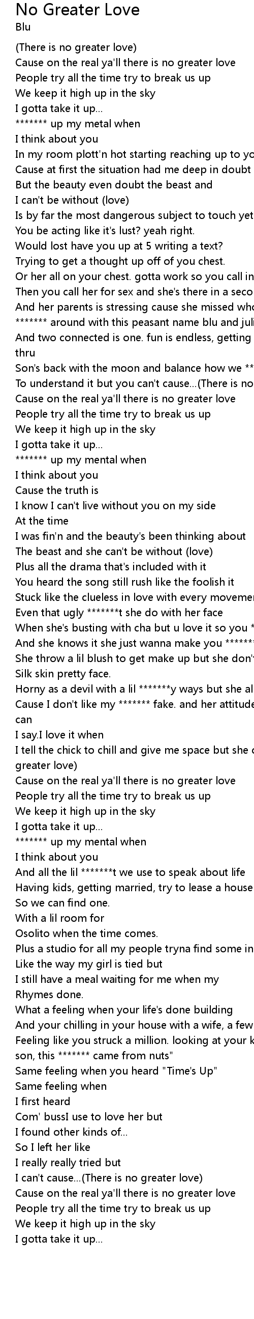 I tell the chick to chill and give me space but she can't cause...(There is no greater love) |