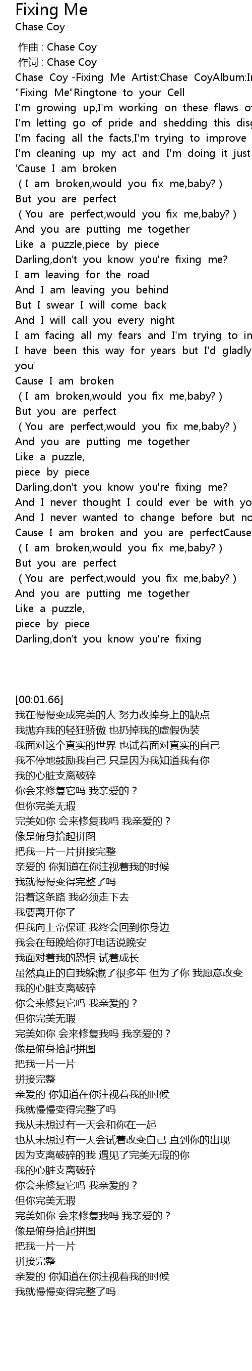 | [00:01.66] | Chase Coy -Fixing Me Artist:Chase CoyAlbum:Indiana SunSend "Fixing Me"Ringtone to your Cell |