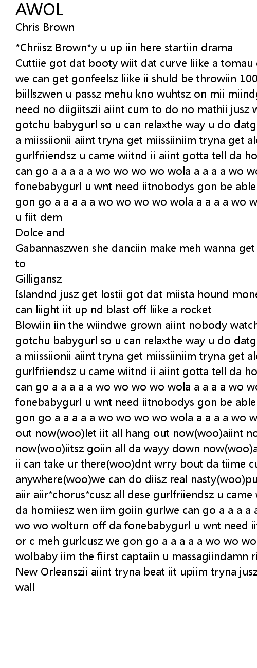 Cuttiie got dat booty wiit dat curve liike a tomau can diisappear iin mii hand tiill tomorra [x2]we can get gonfeelsz liike ii shuld be throwiin 100 dollar biillszwen u passz mehu kno wuhtsz on mii miindgurl u aiint gotta ask mehii dnt need no diigiitszii aiint cum to do no mathii jusz wanna get gon*chorusz*ii gotchu babygurl so u can relaxthe way u do datgurl da way u move datu kno iim on a miissiionii aiint tryna get miissiiniim tryna get alonecusz all dese gurlfriiendsz u came wiitnd ii aiint gotta tell da homiiesz wen iim goiin gurlwe can go a a a a a wo wo wo wo wola a a a a wo wo wo wo wolturn off da fonebabygurl u wnt need iitnobodys gon be able to reach iit or c meh gurlcusz we gon go a a a a a wo wo wo wo wola a a a a wo wo wo wo wolgot damn ii love da way u fiit dem |
