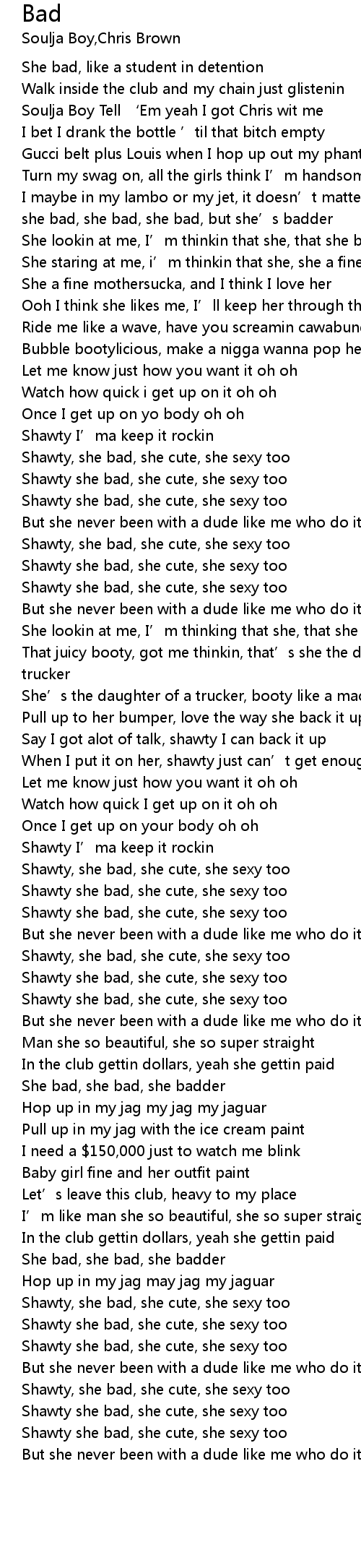 | [03:20.050] | Shawty she bad, she cute, she sexy too |