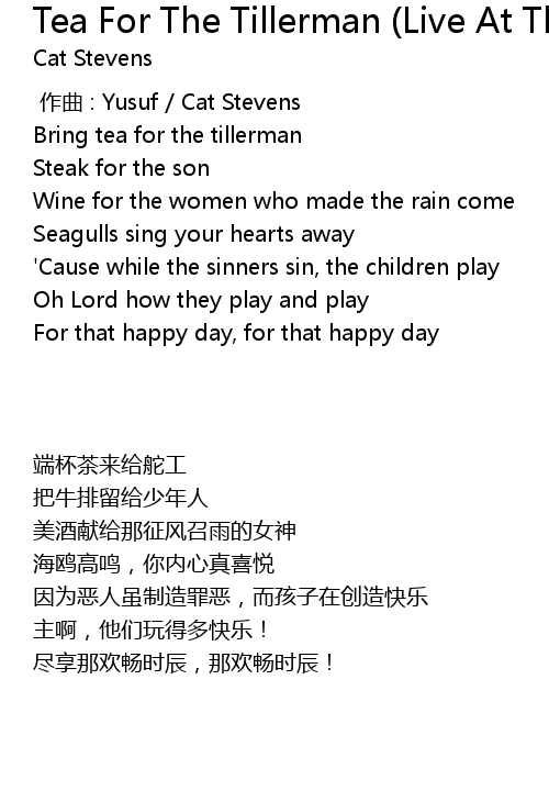 | [00:14.886] | Bring tea for the tillerman |