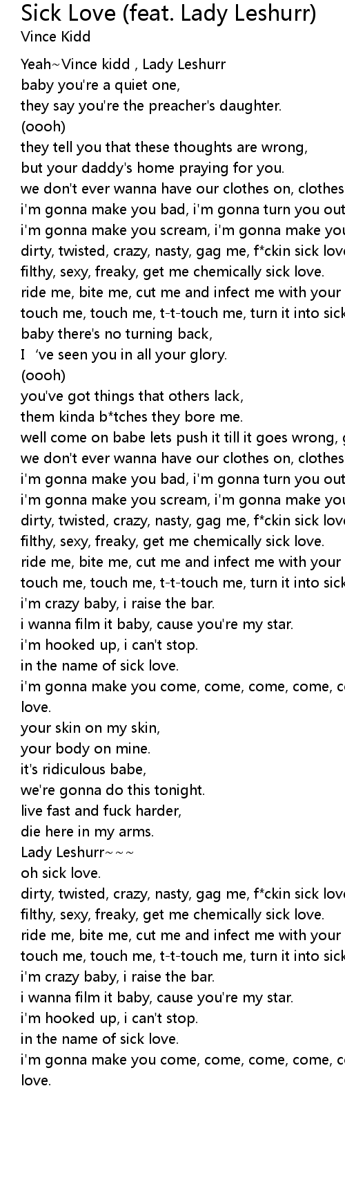 | [00:50.17] | filthy, sexy, freaky, get me chemically sick love. |