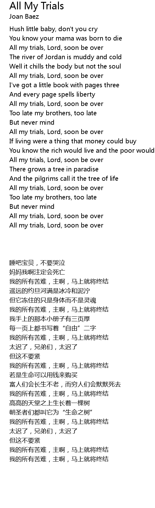 | [02:43.68] | All my trials, Lord, soon be over |