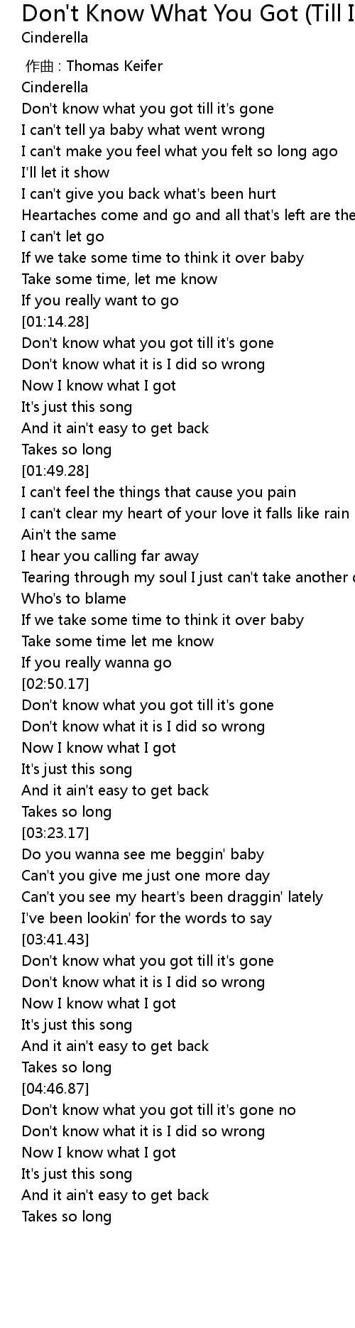 | [00:02.99] | Don' t know what you got till it' s gone |
