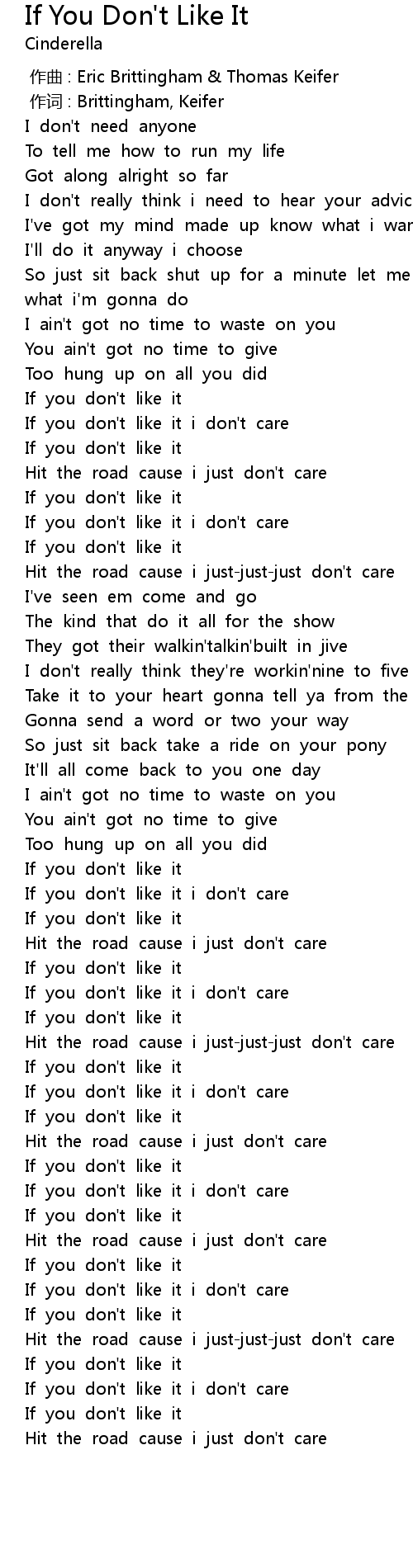 | [01:36.244] | Hit the road cause i justjustjust don' t care |