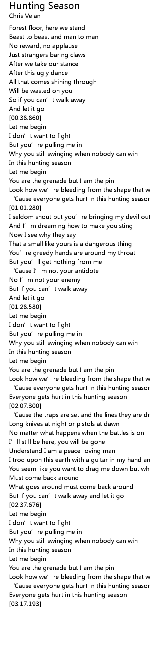 | [01:46.669] | ' Cause everyone gets hurt in this hunting season |