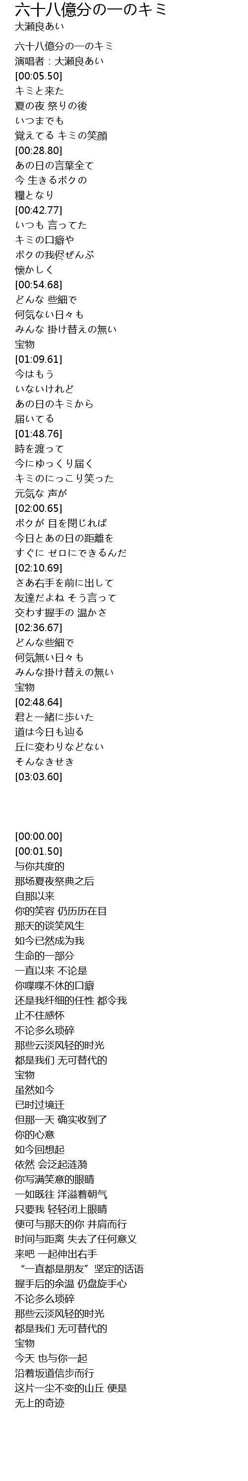 | [00:00.00] | 六十八億分の一のキミ |