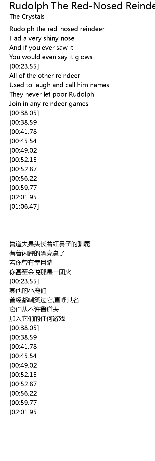 | [01:58.21][00:59.77] | "Rudolph the red-nosed reindeer “ |