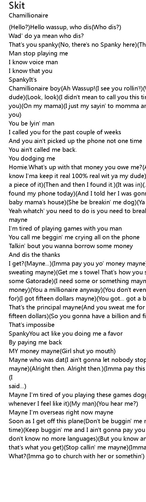 Homie.What's up with that money you owe me?(Aww man)(Listen, hey listen Bro)(Ya know I'ma keep it real 100% real wit ya my dude)(I dropped my phone then I lost a piece of it)(Then and then I found it.)(It was in)(...Ya know what I... I found my phone today)(And I told her I was gonna call you)(And plus was at my baby mama's house)(She be breakin' me dog)(Ya know) |