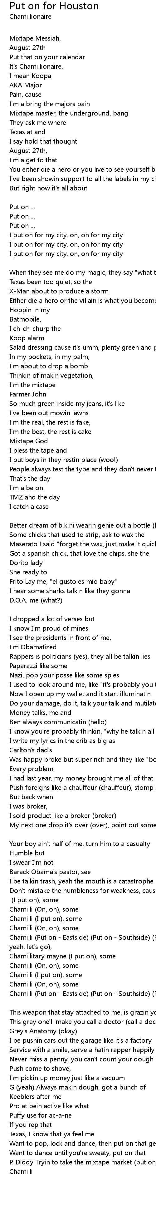 I put on for my city, on, on for my city [Verse 1 - Chamillionaire] |