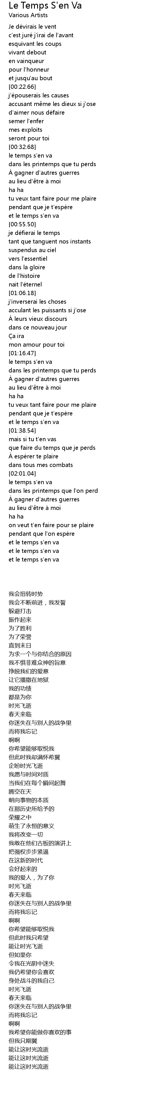 | [00:14.28] | c' est jure j' irai de l' avant |