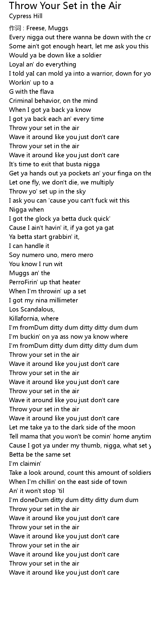 | Song | Throw Your Set in the Air |