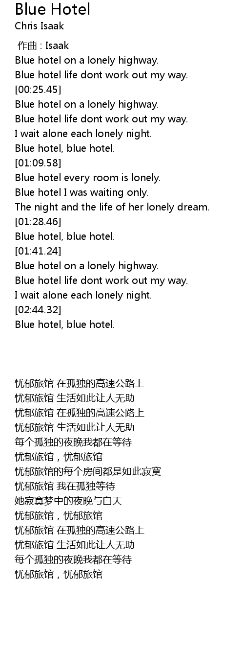 | [00:40.30] | Blue hotel on a lonely highway. |