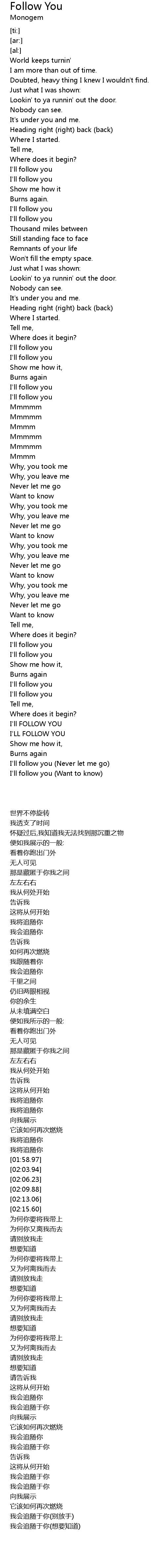 | [03:31.36] | I'll follow you (Never let me go) |