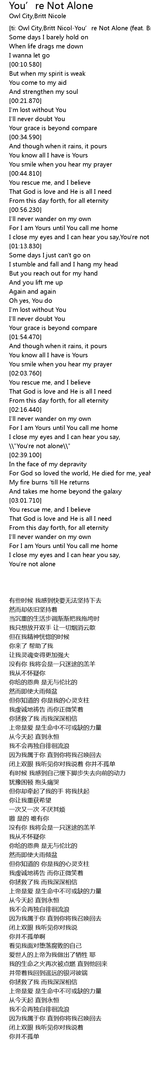 | [ti: Owl City,Britt Nicol-You’re Not Alone (feat. Britt Nicole)] | |