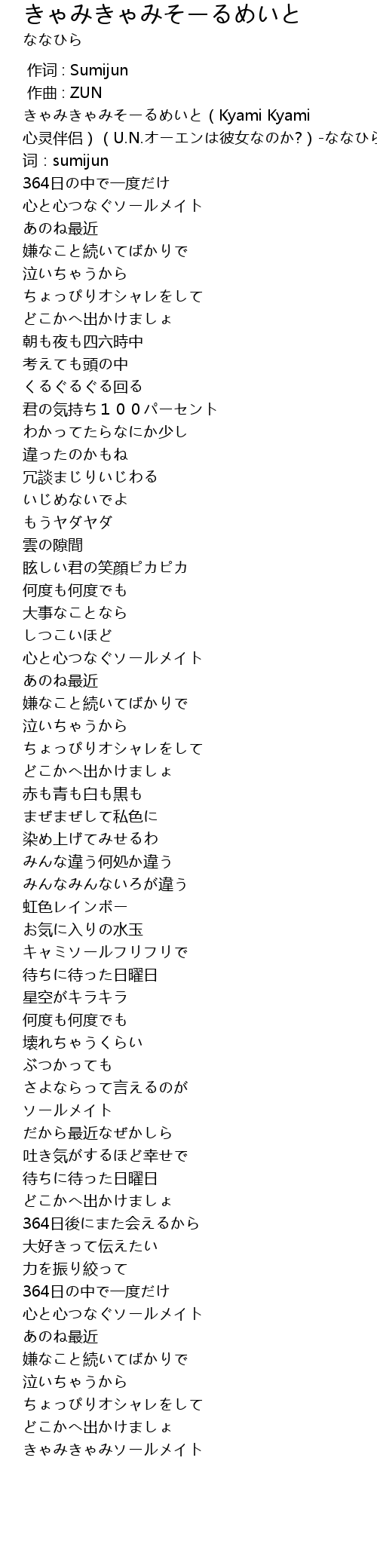 [00:00.365] きゃみきゃみそーるめいと(Kyami Kyami 心灵伴侣)(U.N.オーエンは彼女なのか?)-ななひら