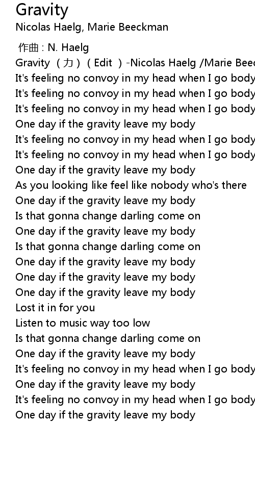 | [00:00.00] | Gravity li Edit Nicolas Haelg Marie Beeckman |