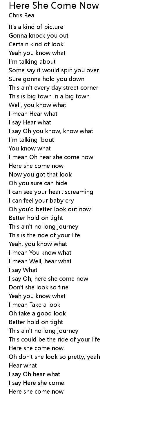 I say Oh, here she come now |