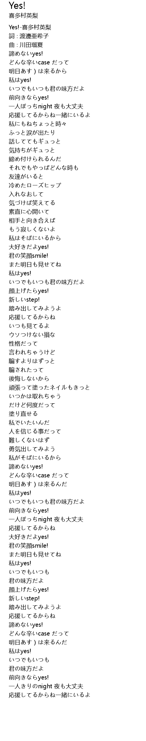 | [00:01.810] | Yes! xǐ duō cūn yīng lí |