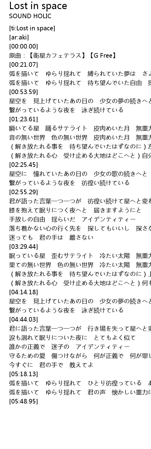 | [03:45.21] | 眠っている星 歪むサテライト 冷たい太陽 無重力の言葉 |