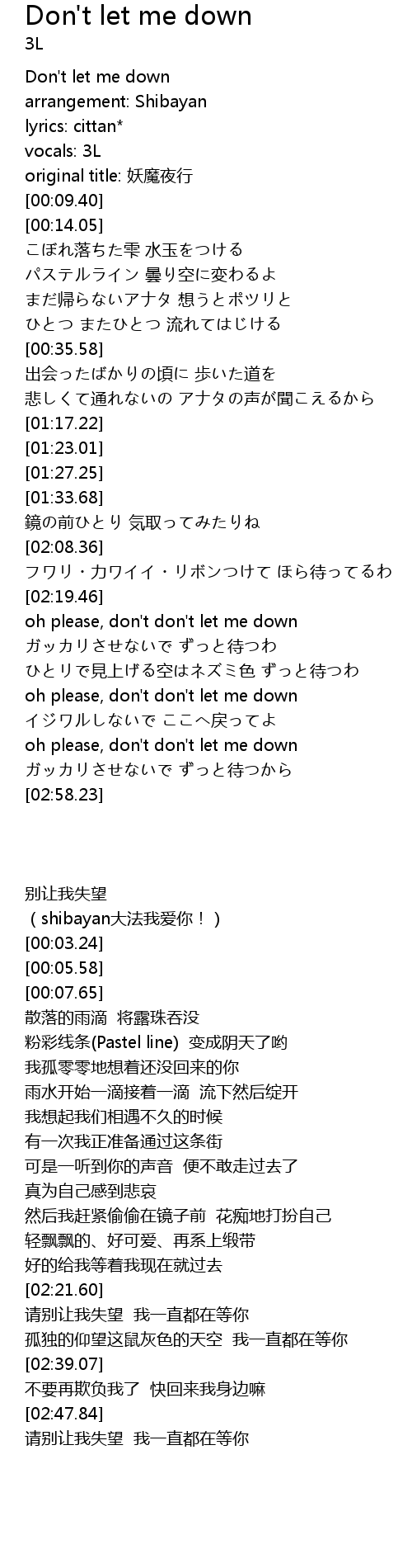 | [02:24.20] | ガッカリさせないで ずっと待つわ |