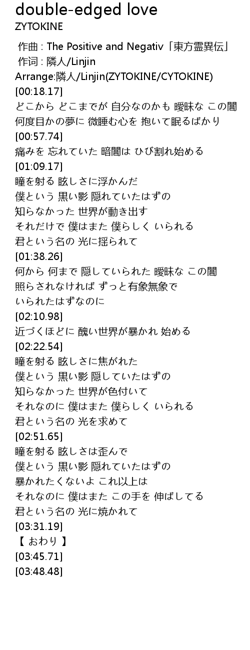 | [00:09.71] | Arrange: lín rén Linjin ZYTOKINE CYTOKINE |