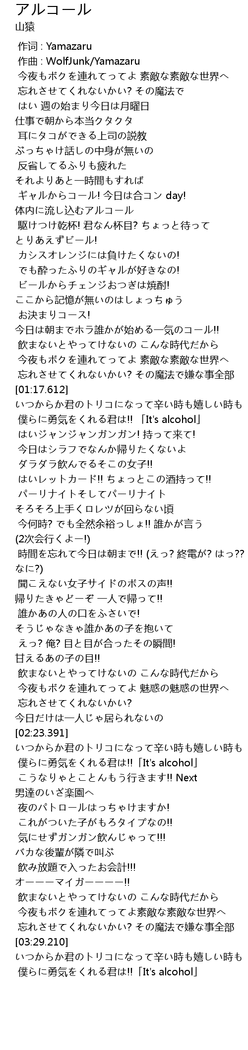 | [03:36.824] | 僕らに勇気をくれる君は!!「It's alcohol」 |