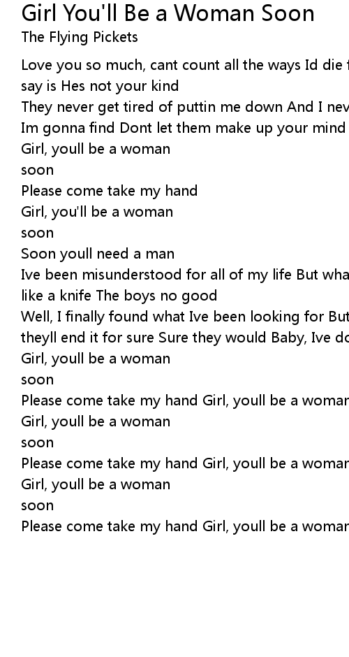 Please come take my hand Girl, youll be a woman soon Soon youll need a man