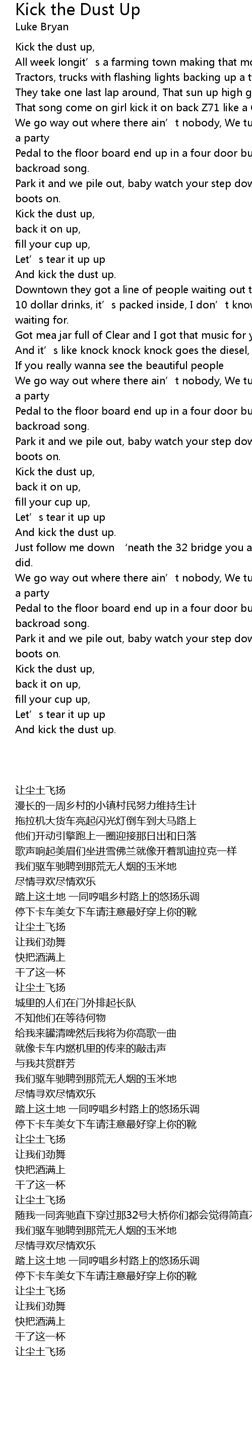 | [02:45.000] | Pedal to the floor board end up in a four door burning up the backroad song. |