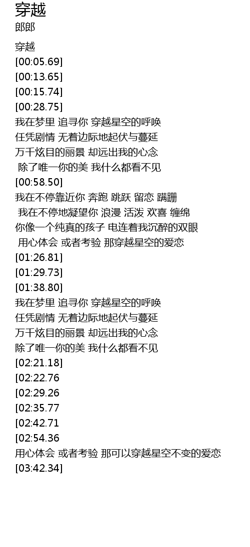 | [03:22.72][02:42.71] | 用心体会 或者考验 那穿越星空的爱恋 |