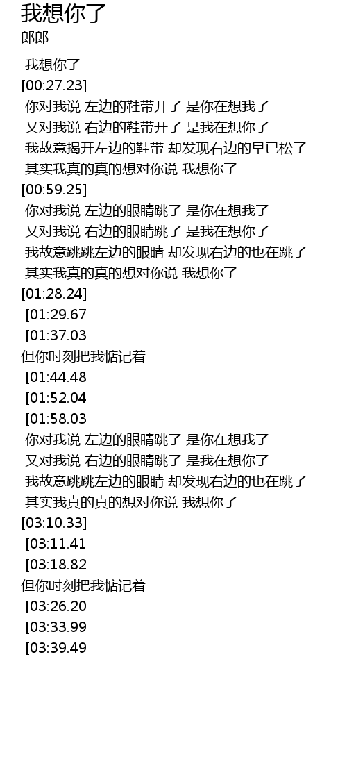 | [03:04.60] | 其实我真的真的想对你说 我想你了 |