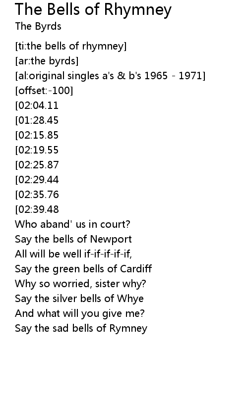| [00:11.67][01:28.45] | Say the sad bells of Rhymney |